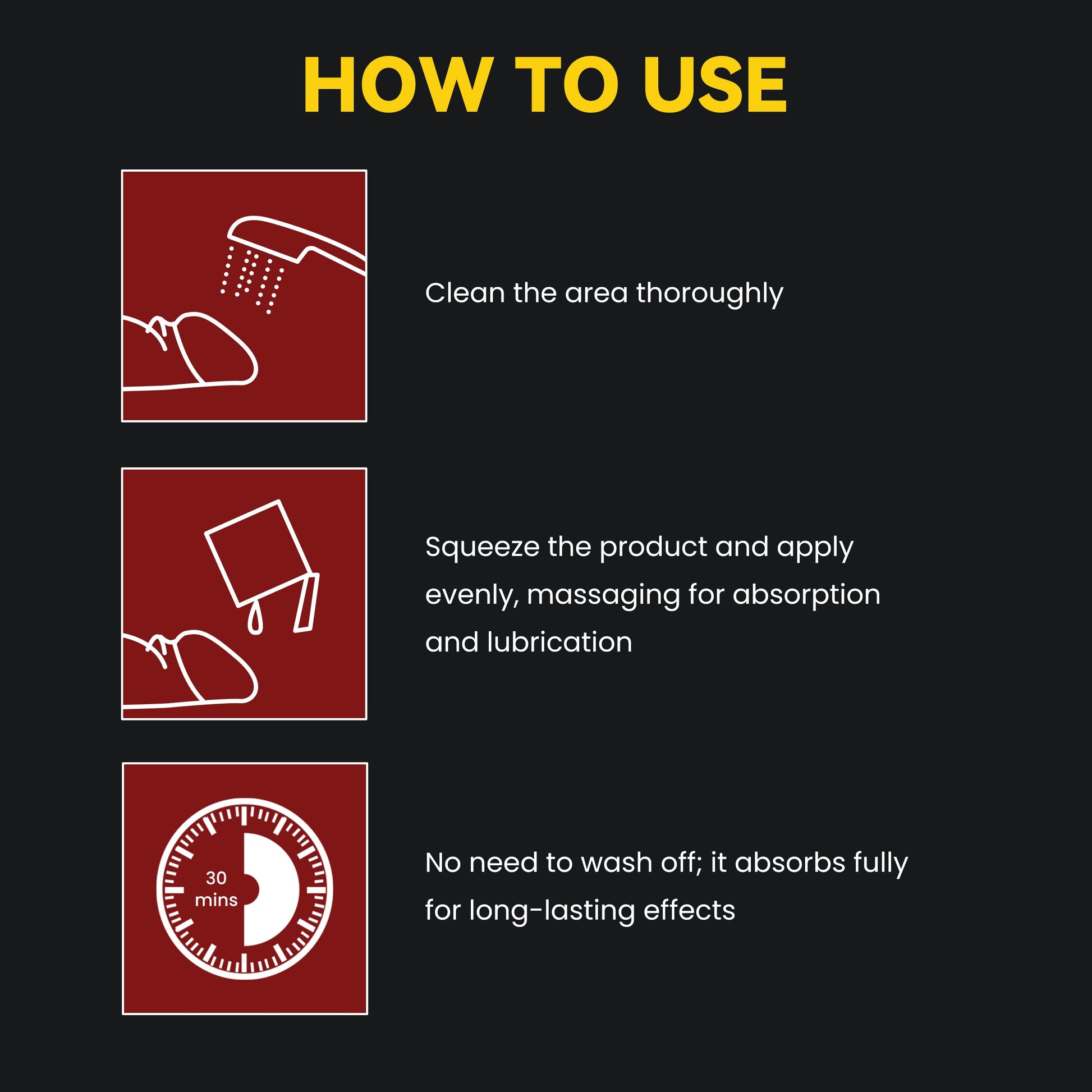 Apply one packet daily to clean, dry skin. Gently massage the product into the desired areas until fully absorbed. No need to wash it off.